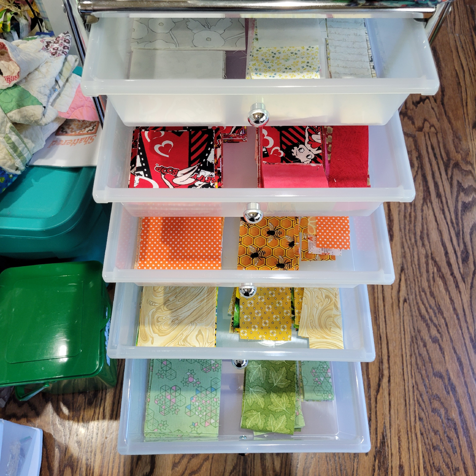 I'm still cutting and organizing scraps. I can do this seated, and plan to get this cart filled and organized in the next week or 2.